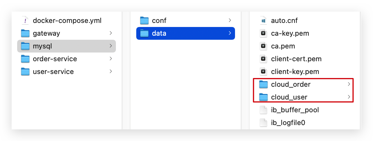 查看mysql目录,可以看到其中已经准备好了cloud_order、cloud_user表: