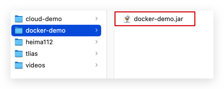 image-20210801101207444 步骤2:拷贝课前资料中的docker-demo.jar文件到docker-demo这个目录