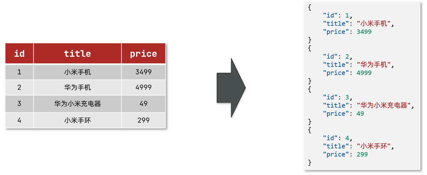 而Json文档中往往包含很多的字段(Field) ,类似于数据库中的列。