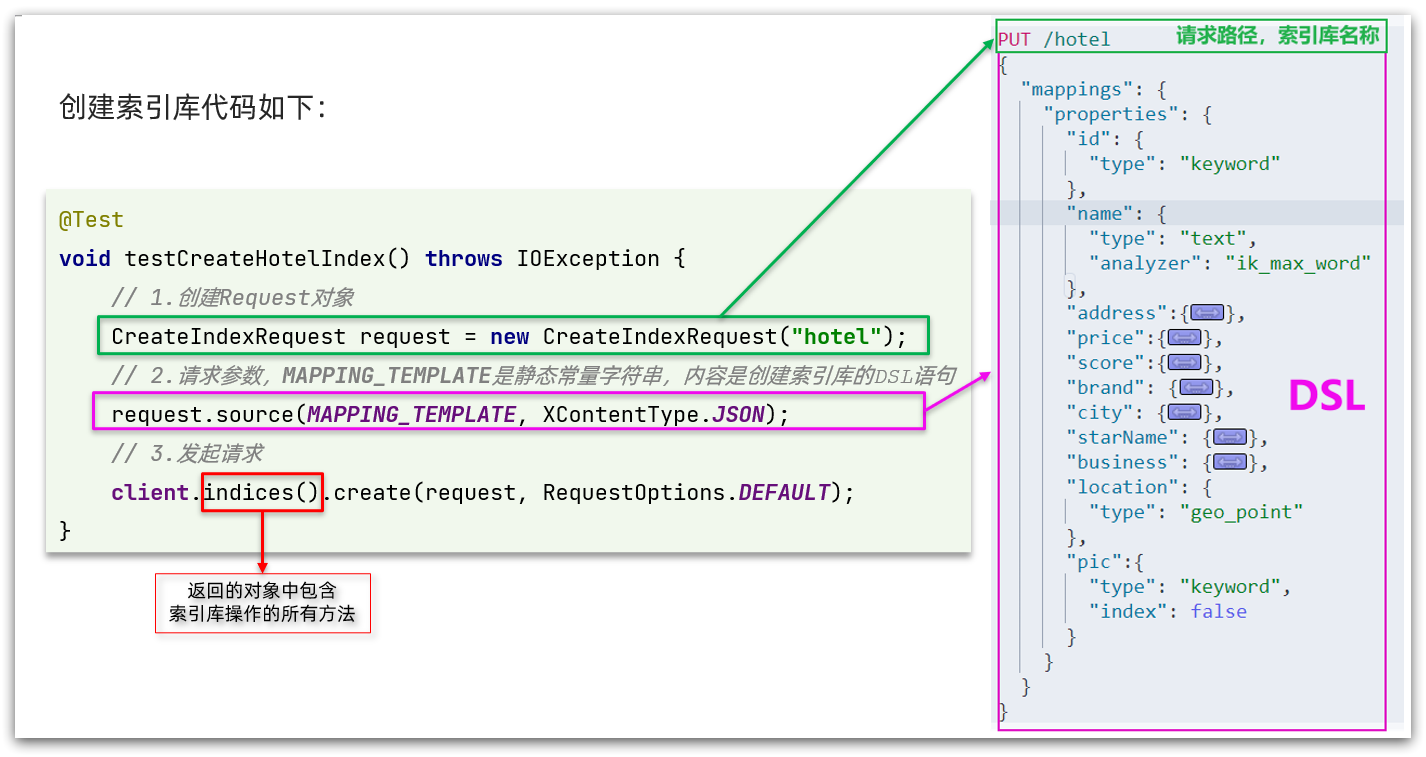 JavaRestClient操作elasticsearch的流程基本类似。核心是client.indices()方法来获取索引库的操作对象。