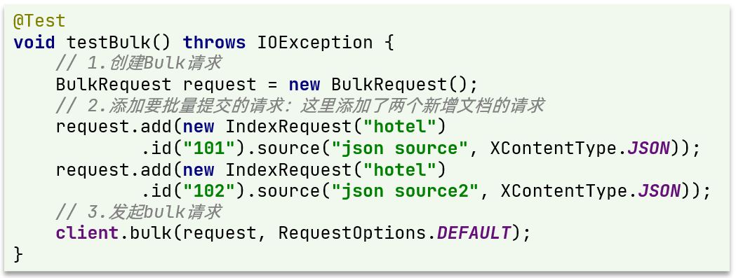 批量处理BulkRequest,其本质就是将多个普通的CRUD请求组合在一起发送。