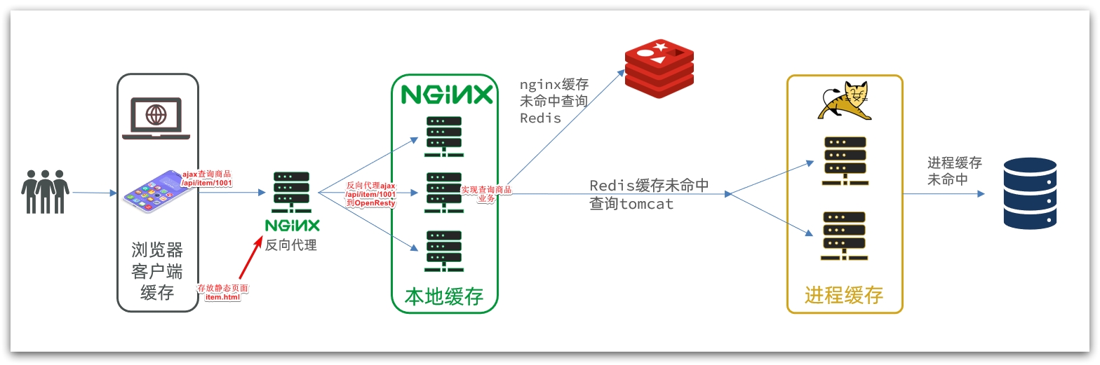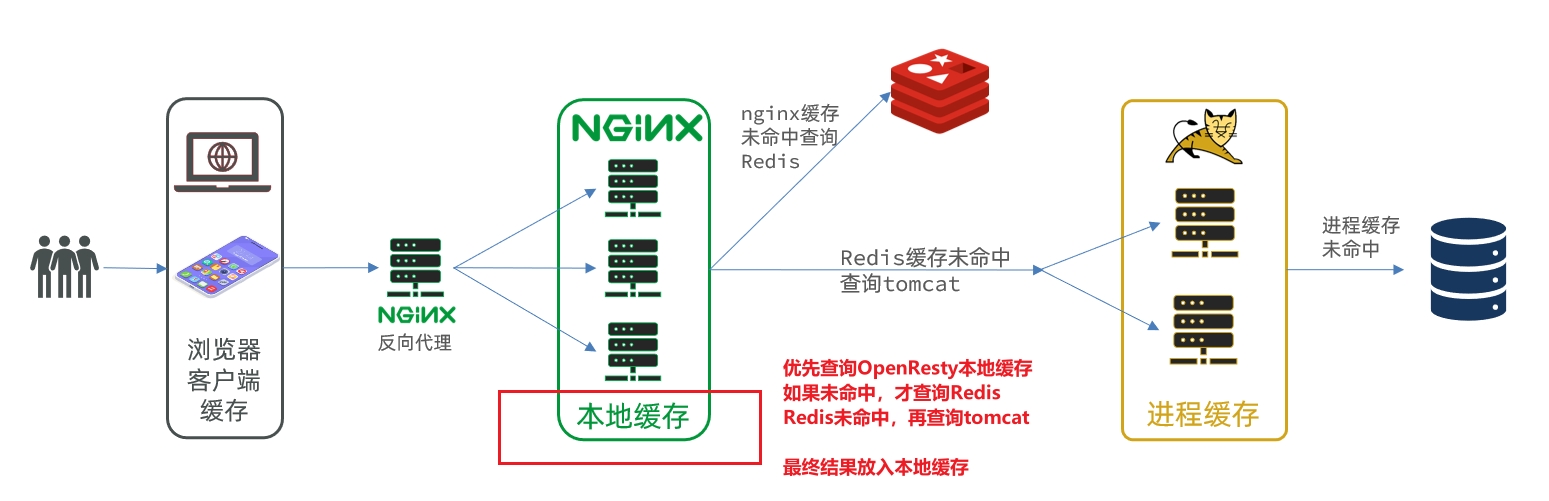 在多级缓存架构中,Nginx内部需要编写本地缓存查询、Redis查询、Tomcat查询的业务逻辑,因此这样的nginx服务不再是一个反向代理服务器,而是一个编写业务的Web服务器了。