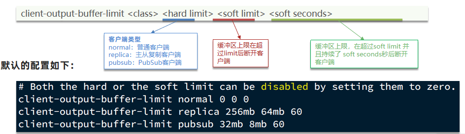 客户端缓冲区:指的就是我们发送命令时,客户端用来缓存命令的一个缓冲区,也就是我们向redis输入数据的输入端缓冲区和redis向客户端返回数据的响应缓存区,输入缓冲区最大1G且不能设置,所以这一块我们根本不用担心,如果超过了这个空间,redis会直接断开,因为本来此时此刻就代表着redis处理不过来了,我们需要担心的就是输出端缓冲区