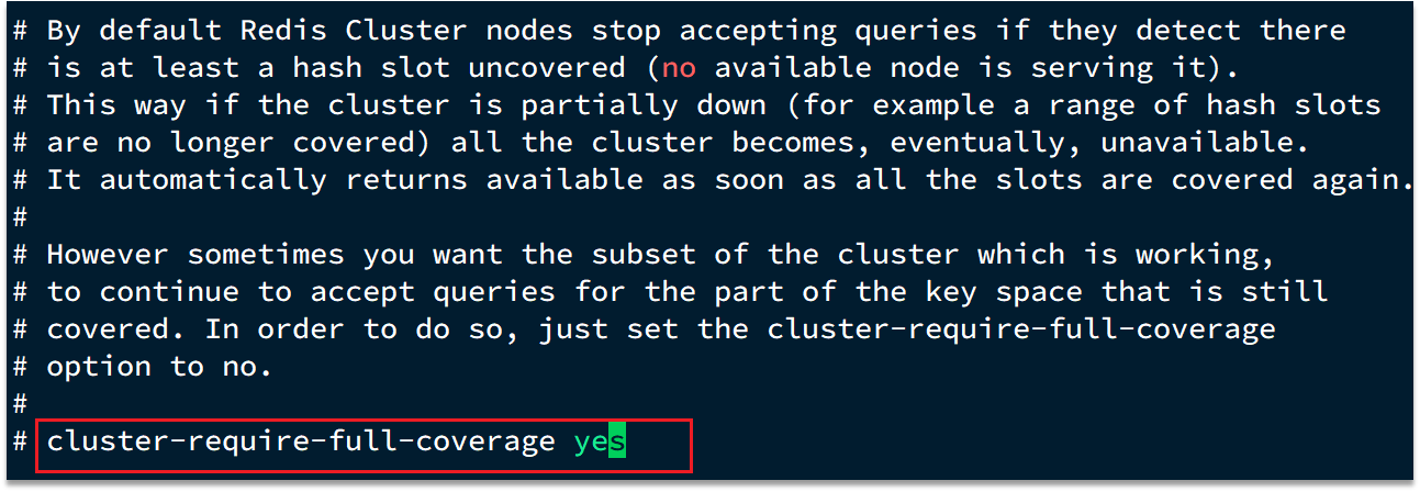 大家可以设想一下,如果有几个slot不能使用,那么此时整个集群都不能用了,我们在开发中,其实最重要的是可用性,所以需要把如下配置修改成no,即有slot不能使用时,我们的redis集群还是可以对外提供服务