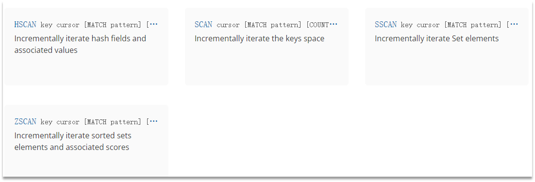 scan 命令调用完后每次会返回2个元素,第一个是下一次迭代的光标,第一次光标会设置为0,当最后一次scan 返回的光标等于0时,表示整个scan遍历结束了,第二个返回的是List,一个匹配的key的数组