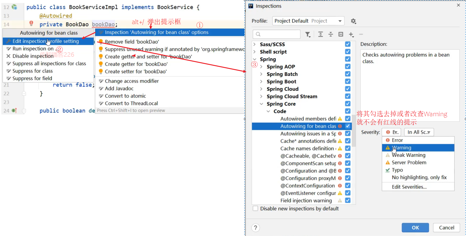 bookDao 在 Service 中注入的会提示一个红线提示,为什么呢?